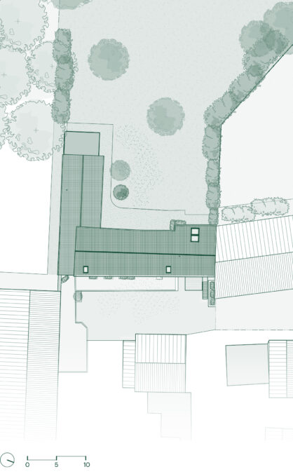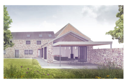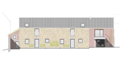 Le projet porte dans un premier temps sur la rénovation du corps de logis principal, afin de le moderniser dans son organisation spatiale et son rapport à l’extérieur tout en conservant l’âme et l’esprit du lieu. De nouveaux percements sont aménagés, afin de fluidifier les circulations et faire entrer de manière plus généreuse, mais contrôlée, la lumière naturelle. Les charpentes sont également corrigées et adaptées dans le volume principal, et le généreux volume secondaire subit une transformation structurelle conséquente en vue de faire disparaître son pignon au profit d’une ouverture totale sur le jardin.